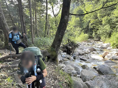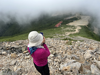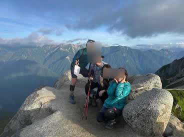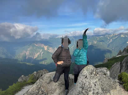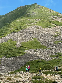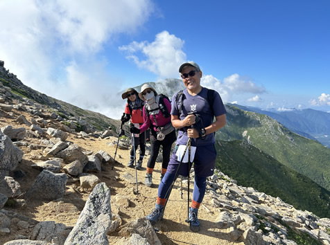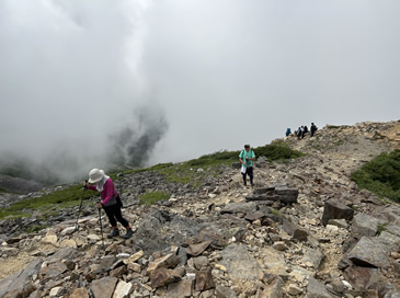 5時前に起き、タクシー会社に連絡を取り、軽い朝食後、5時45分に出発。2,3十分で一の沢登山口の崩落現場手前に到着。6時半、ここから常念登山のスタートだ。登山口には30分程度で着きここから沢渡りルートとなる。35度位の猛暑だが、沢からの風はひんやりして気持ちいい。こんな感じの環境の良い登山道が6,7割を占める。でも、さすがに胸突き8丁辺りからは急登だ。女性陣も良く登ったなぁ。12時過ぎ、稜線にでるとそこは常念小屋の目の前だ。今回はここですぐに雷鳥の出迎えを受けた。まるで待っていたように飛んで来て辺りをうろうろする。しかも親子だ。こんなに警戒しないのはやっぱり日本人の人徳だね。他の地域ではあり得ないことらしい。小屋で荷物を置き早速山頂アタック。見た目の雄大さに対し、足元はゴロゴロ岩の歩きにくい登山道で、傾斜も見た目より急だ。また、山頂は完全な岩場で落ちたら無事に戻れることはない。なんとか登頂し、さて下山。ゴロゴロ岩の危険度は下山時に発揮。浮石に乗って転倒したら年取った体は破壊される。しかも雄大な一定の傾斜なのでいっこうに進んでいなさそうに感じ、焦る。初心者登山にはきつい山だと知った。なんとか15分前に山荘につき、すぐに食事し、ラッキーな4人部屋にて就寝。でも、下山時に神経を使ったせいか朝までしっかり眠ることはできなかった。