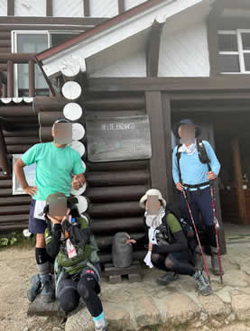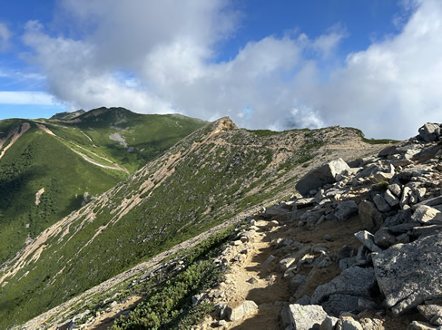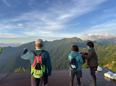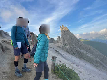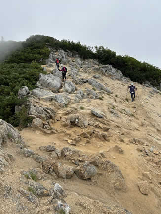 5時からの食事を済ませ、6時過ぎに燕岳への稜線歩きに出発した。当初は平らで整備された稜線を予想していたが、現実は厳しい。最初から2700m以上の横通岳にむけた急登となる。これはメンバーのメンタルをかなり削った。それでもここをぬければやはり高低はるが程度は小さくなった。そして、やはり稜線歩きは気持ちいい。だけど、低山の稜線に比べ高さも距離も桁違いなので、見た目の距離感、到達時間がかなり違ってくる。まずは稜線歩きの素晴らしさと厳しさを知った。それでもなんとか東天井岳を抜け、大天井ヒュッテに11時過ぎにたどり着いた。ここでも雷鳥の出迎えを受ける。しかし、なんてかわいい鳴き声なんだ。ここでは、ランチは注文するほど腹減ってないので、手持ちのおにぎりやカロリースナックでエネルギーを補給し、稜線歩き後半に突入した。すると今後は喜作レリーフに向けた急こう配のゴロゴロ岩の道だった。これには神経を使った転倒が重大災害に繋がる。そしてやっと下りきったと思えば、今度は梯子と鎖だ。この鎖は足場はわかりやすくきちっと足を運べるがやはり初心者にとっては恐怖の高所の鎖だった。混みやすいことともあり、メンバーはかなり無理して渡ったようだった。あとで話を聞いてその大胆さに背筋が凍った。その後も細くて切れ落ちた稜線や再度の登り返しなどが続き、なんとか蛙岩に到着。ここでは先行の登山者の間違えにメンバーが着いていてしまったり、〇山が一人で先に行ってしまい、呼んでも返事がないなど素人らしいミスを犯し慌てた。登山道を戻り正規ルートを見つけるなどの基本ルールで解決したが、いろいろあるねぇー。このあとは燕岳まで予想していた優しい稜線ルートにて15時前に燕岳山荘に到着。1850の遅い夕食までビール500ml、カップ酒2本でなんとか持ちこたえた。ここでは、二組用二段ベットにて気軽に寝落ち。3時半まで目を覚ますことはなかった。