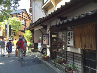 黒川の両脇にある温泉街だが、よくできた温泉街だ。きっと誰がコンサルタント的な人がトータルコーディネートした温泉だ。清潔感があり、同一のトーンでデザインされているが、アキが来ない工夫がされ、ソロぞれの温泉もこれにしたがっている。でも、やっぱり俺には作りすぎ、もう少し雑で汚い部分もあって多様性があるほうが自然だな。でも、女子には相当人気があるようだ。右写真は常に人気上位の新明館の玄関付近。