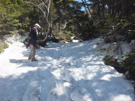 三合目は、一度勾配の緩い舗装道路になる。これには騙された。そのあと9合目までの地獄の登山道には、打つひしがれた。中写真が3合目からの登山増だが、ゴロゴロ転がった岩の上をあるいて急こう配を上がっていく。これはきつい。そして、5合目あたりからは右写真のような雪の登山道だ。本格的な登山靴でもなし、滑り止め防止も持っていないし、ストックもない。この雪と岩の登山道は、登りも下りも精神面体力面ともにへとへとにさせられた。