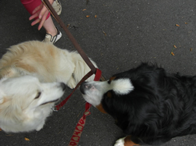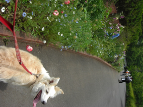 こんな道を行けば、すでに他の犬と遭遇。こんあお花畑も途中にあり。