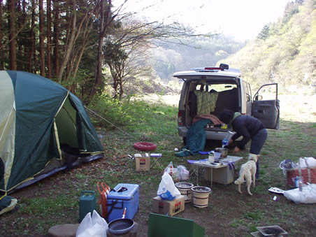 5月の大型連休の中日、元シロと家族で野反湖キャンプに向かった。でも、野反湖は氷の世界。さすがに氷上キャンプは経験なし、危険もあるので、ここは中止し、下流の尻焼温泉付近の川のほとりにキャンプすることにした。尻焼温泉も野反湖も数回づつ来ているのであまり新鮮さのあるキャンプにならなかったが、ゆっくりと過ごすことができた。キャンプ中、元シロをつないで釣りや温泉に出かけたが、この二か月先に老衰で死んだので、かわいそうなことをした。そういえば、なぜかこのころから元気がなさそうに見えたもんな。下写真中央は野反湖の様子。5月だってのに氷の世界だ。右写真は、キャンプ地だが、やはり元シロは萎びたように見える。