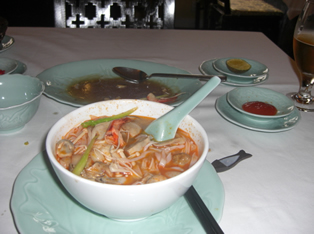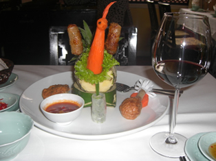 前菜の盛り合わせ。つくねとさつま揚げと春巻き。ついでに、ソフトシェルクラブの揚げ物。 ビール日本とワインを飲んだ後、アスパラの炒め物とタイ風ファー。 全部で約1000ギン。約4000円。たいして高いわけじゃないんだけど、なぜか高く感じたんだよねー。