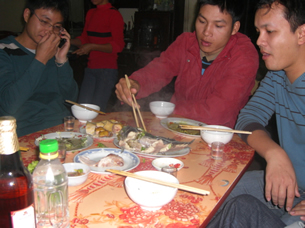 国道1号沿いのレストラン、10人の若者と豚足、ロース、コウサイサラダ、皮つき鶏肉、雷魚の姿煮、スープ、麺を食べ、ハノイウォッカをしこたま飲んで、630ギン、約2500円。この後、勢いでローカルのカラオケへ。