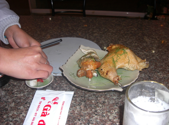 店内一階の様子。どんな店かなと見てたら女の子に連れ込まれちゃった。右はチキンの蒸し焼き。なかなかいい。