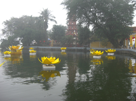 この道路を南下し、ほぼ一周すると、また有名なお寺がある。 もとは李南帝(544〜548年)時代にホン河のほとりに建立されたベトナム最古の寺(当時の名称は開国寺)。17世紀に今のタイ湖畔の小島に移され、名前もチャンクオック(鎮国)寺と改称された。境内には釈迦や菩薩、関羽やチャン・フン・ダオまで、さまざまな神様や聖人が祀られているとのこと。右写真も仏像は大きかったよー。