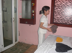 8日(日) やっぱり午前テニスは体調不良でがたがただった。気を取り直して、午後は、hung sen というマッサージへ。ここは裏切らない。薬草樽風呂と、ジャグジー、サウナの後は、ほんもののマッサージ。合計2時間というコース。今度子供たちが来たら連れて行こう。女性も多く来ているようだし。350ギンのVIPコースは全然高く感じない。行ってよかったねー。マッサージでのどを乾かせた後は、アパートにて、ワイン、パスタ。まあ、二連休もこんなもんかな。 受付と待合室、終わったらお粥が無料。 マッサージ台とサウナ(左)。 キャビネの後ろに樽風呂とジャグジー。