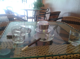 今日の一日。5時から7時までテニスし、朝飯は、いつもの川魚ラーメン。この町は、いくつもの川が合流してるから、川魚の名産なんだ。その後は隣のしゃれた喫茶店にて、朝コーヒーと葉巻。(左写真)これ最近覚えたコース。このコーヒーは格別だ。また葉巻とよく合う。まあ、葉巻っても、正式な奴じゃないけど、この店で一本売りしてくれる。休憩後、近くの川の探索へ。この川は出勤途中によく見るけど、浮草の量が毎朝違ってる。(写真右)