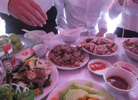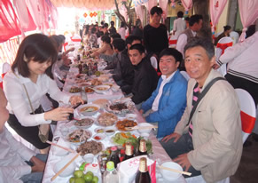 やっと少し動けるようになってきた。今朝は8時に自宅でピックアップしてもらい、再度タイビンでの結婚式にでた。ここの名物料理は猫。また出てきました猫料理。左写真の真ん中の皿がそれ。今回は最初から言われていたので味わって食べた。でもやっぱり犬同様独特のにおいが気になる。人間と同じようなもの食べる犬猫はこういう匂いになるのかなー。ってことは人間食べたらこの匂いかなー。右写真の女性も犬も猫も好きだって。朝からベトナム自家製焼酎さんざんのんで、気がついたらこの時間だ。