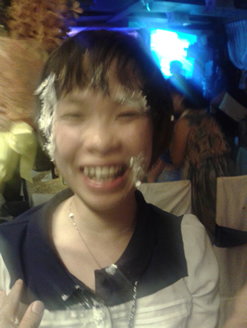 パーティー終盤ケーキカット後に塗りつけられた女性スタッフ。俺にもいたるところにケーキが付いていた。右写真は、比較的若いスタッフ。女性スタッフは7割方アオザイ着てきていたね。