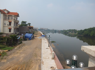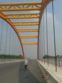 朝テニスできなかったので、朝サイクリングに切り替えた。いつものコースを行くと、いつの間にか完成してるじゃないか大きな橋が。この街は、三つの川の合流地点に栄えていて、一つはベトナム北部最大のホンソンからこの街に分流してきている。この川はどっちに流れてるかわからないくらいゆっくりとたどり着き東から合流する。この川の川向こうつまり北側は非常に美しい景色で、これまでは神秘的でさえあった。当然交通は非常に不便。ここに大きな橋がかかったんだ。さっそく、川向こうを探検してきた。りっぱな橋だー。どこの国の技術なんだろーか。しかも、川沿いに遊歩道なんかも作っている。街路灯もさんざんあるねー。国道一号線脇には街路灯なんてないのに。