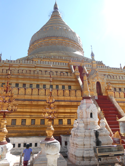 ニャンユー近くの川沿いには、バガン遺跡の玄関口とも言えるシュエジーゴン寺院がある。ここは、ヤンゴンのシェーダゴン同様、兎に角広大、豪華、金ぴかな寺院だ。昼食時のビールと揚げ物もあってか、暑くて疲れた寺院だった。ただ、東西に走る回廊の大きなにはびっくり、地下鉄の大きなターミナル駅ぐらいの規模がある。