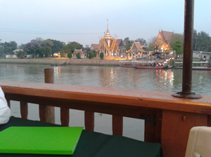 先月末と昨日1日にかけ、タイのアユタヤ方面にまた出張。先週末にテモによる道路封鎖は終わっていた。バンコクにホテルとりゃ良かったかな。前回と同じアユタヤのホテルに宿泊した。初日仕事後は先方t社hさんと夕食に。ここは、sai thong という川沿いのタイ料理レストランだ。マイルドだとの話だが、やっぱり料理は辛い。翌日朝は大変な思いをする。でも、生演奏の川沿いの屋外レストランで対岸にはライトアップされた遺跡が見れ、いいところだった。翌朝は、工場にうかがうまで時間があったので、ホテル近郊を散歩した。アユタヤ駅は、なかなか趣があっていい。駅前通りの先には、ボートツアーの看板があったので、行って見た。時間があったので、アユタヤ島を一周することにした。料金を払うと4バーツ。約13円。やけに安い。こりゃ凄いと思い喜んでボートに乗ったところ、対岸で強制的に下ろされた。ただの渡し舟だったんだ。おかげで徒歩でアユタヤ島内を散歩するはめに。気温は40℃。大変な思いをして帰ってきた。仕事後、飛行機の時間に余裕があったので、空港近くにてタイ式マッサージを受けた。1000円くらいで本格的なマッサー時だ。やっぱりどこの途上国も同じだけど、ローカルは非常に過ごしやすい。タイってこんなにいいところだったんだ。下は、初日のレストラン。これは、カップルでくるところだね。生演奏もなかなかだった。