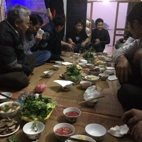 やっぱり今日も忘年会。当然ワーカーの住居地であるドンバンでの宴会だが、今日はあるワーカーの家での宴会になった。多分裕福な家なのだろう宴会のために野生の子豚を落とし、多くのお客を呼んでくれた。これが、今回の宴会だった。家は米俵が貯蔵されている、多分庄屋なんだろう。親戚一同集まり、落としたノブタをねたに宴会が始まった。しかし、ベトナムのお年よりは元気がいい。七十過ぎの老人が、艶やかな女性の話題で盛り上がり、げんざいも精力的なd現役であると主張する。それ引き換え若者のおとなしいこと。現代の日本を見ているようだった。やっぱり、元気で精力的な老人の話のほうがおもしろい。料理は、落としたノブタの内臓、精肉で、兎に角旨い。野生の小型の豚はくせもなく、ほんとに旨かった。特に酒は旨い。料理の旨い家は酒の作り方もうまいようだ。まだ、明日、明後日と宴会は続く・・・。
