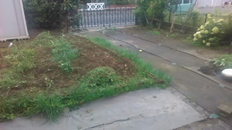 今日は、小雨が続く状態だったが、朝テニスを長女と三人で二時間上谷でやった。一休み後は、庭の草むしりと生垣の刈り込み。延々1時間以上の大仕事になった。やっぱり、こうゆう仕事をするといろいろな虫が出てくる。完全防備でやったが、あちこちかゆい。妻は電気虫に手の指を刺されていた。手入れ後の写真。しかし、いつ見ても見栄えの悪い庭だ。