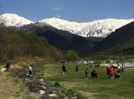 ペンションオーナーに教わった地元の人たちの中大型犬の集まりに行ってきた。松川河川公園にあり、最高環境にあるドッグランみたいなものだ。写真は感じられないが、白馬の白さは圧倒的に視界に迫ってくる。ここの景色はこれぞ北アルプスって感じ。まあ、この町はどこにいってもこういった景色がたのしめるんだけれど。(右写真)