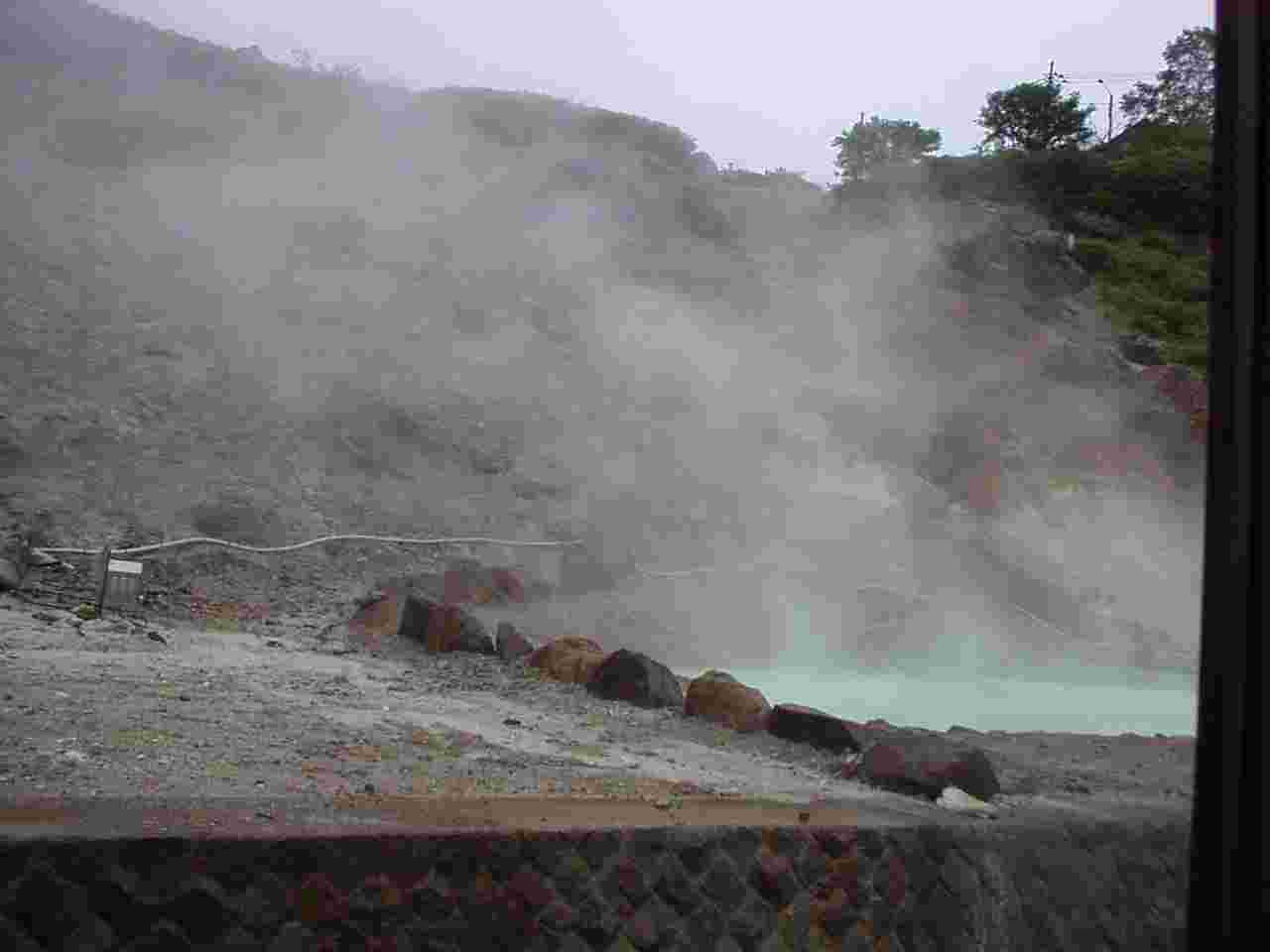 浴室の窓から 源泉らしき池と地獄谷が、山一面に展開しています。地獄谷見学コースもあります。